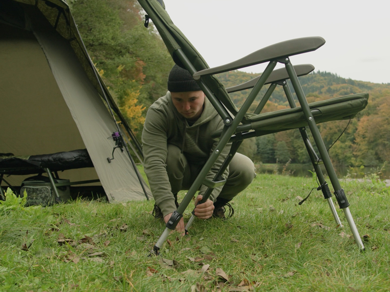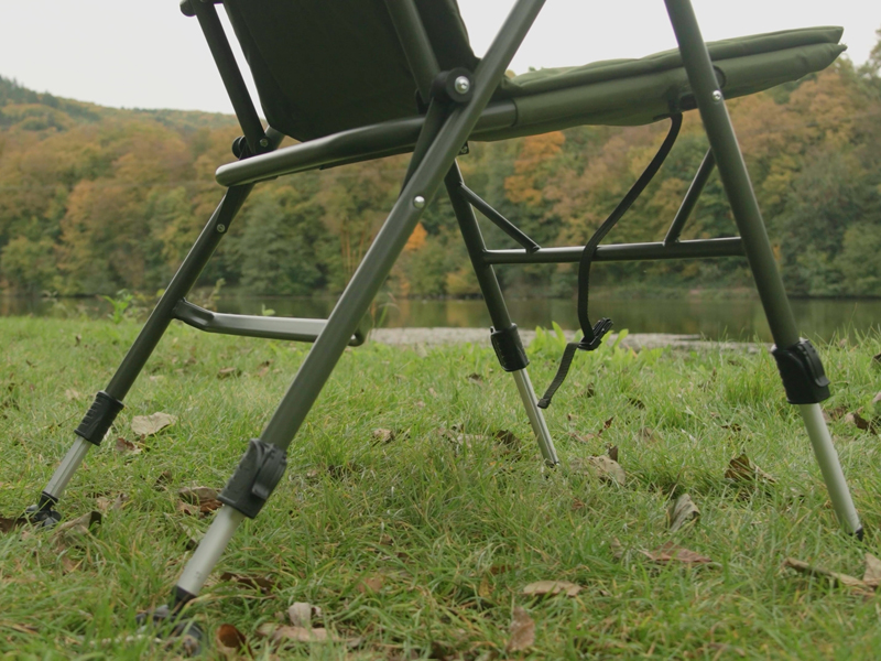 Kõrgust reguleeritavad jalad võimaldavad tooli kohandada ebaühtlase maapinnaga ja tagavad stabiilsuse ka raskemates tingimustes. Laiad ja paindlikud mudatallad takistavad tooli sissevajumist pehmesse pinnasesse. Transpordi ajal hoiab plastklamber tooli kindlalt suletuna ja väldib selle avanemist.