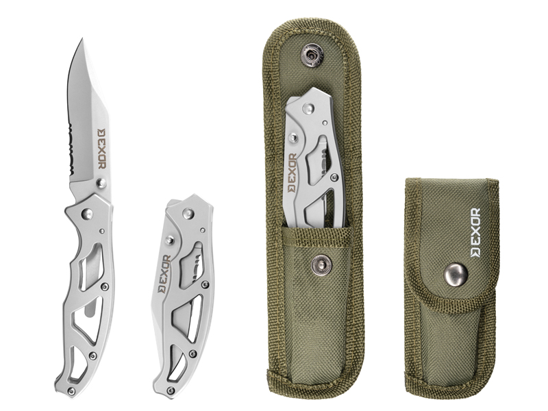 The folding knife EXOR is an ideal tool for every angler and outdoor enthusiast who’s looking for efficiency in a minimalist design. The whole structure is made of metal in a modern design with a skeleton handle. This feature significantly reduces the overall weight. You won’t even feel it in your pocket, but it’s still very durable and sturdy when being used.