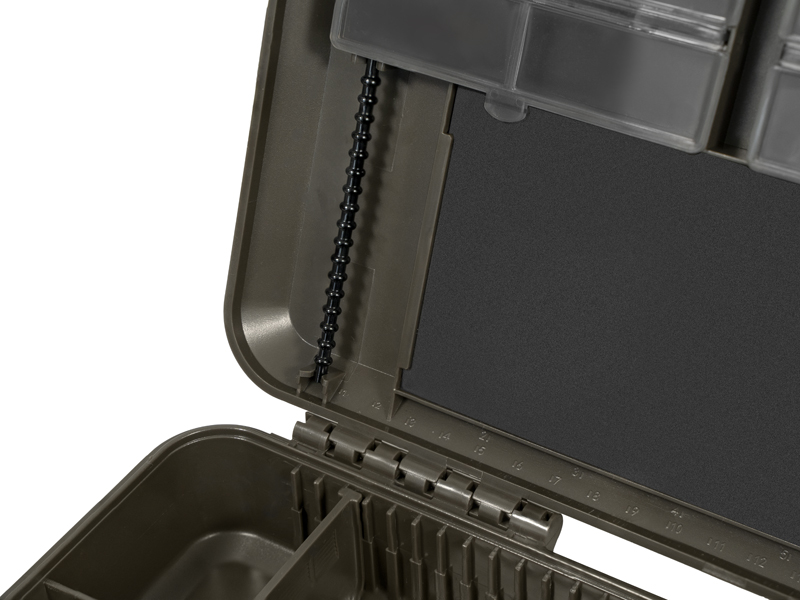 In addition, KlikBox Long has a hardened foam plate with pins to attach the rigs. You’ll find a scale along the entire rig storage area to help you accurately determine their length. The organiser is made from durable plastic, and it’s easy to open and close with robust plastic hinges.