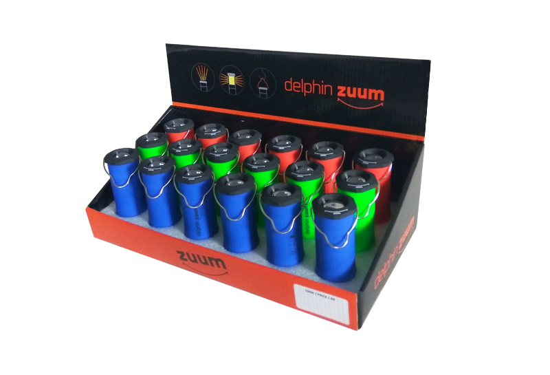 The light Delphin ZUUM is imported in colourful counter presenters and each of them contains 18 pieces of the light (6x green. 6x orange. 6x blue).