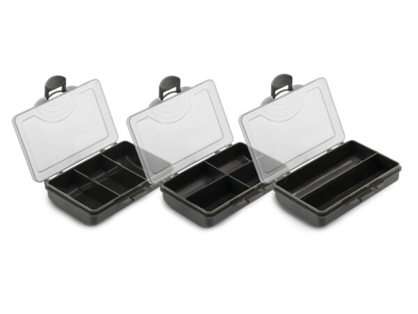 Inside. the case is divided into three parts: the left one is made of foam (26x10x1 cm) and has 10 yellow pins for storing your rigs. the right one has three individual boxes for your carp accessories (10x7x2.5 cm). and the third one is a divider in the middle with a zip pocket. Here. you can store scissors or other small items. This top-notch model is an absolute bargain!