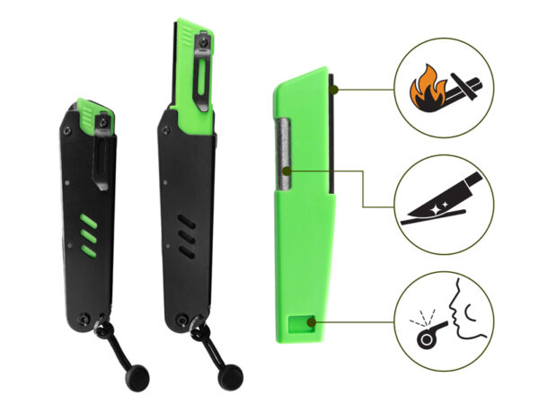 There’s also a detachable part inside the knife that holds a file, a whistle, and a flint. With a flint and the knife blade, you can start a fire without having to use a lighter. The file is perfect for sharpening the knife or hooks, and the whistle can scare away wild animals.
