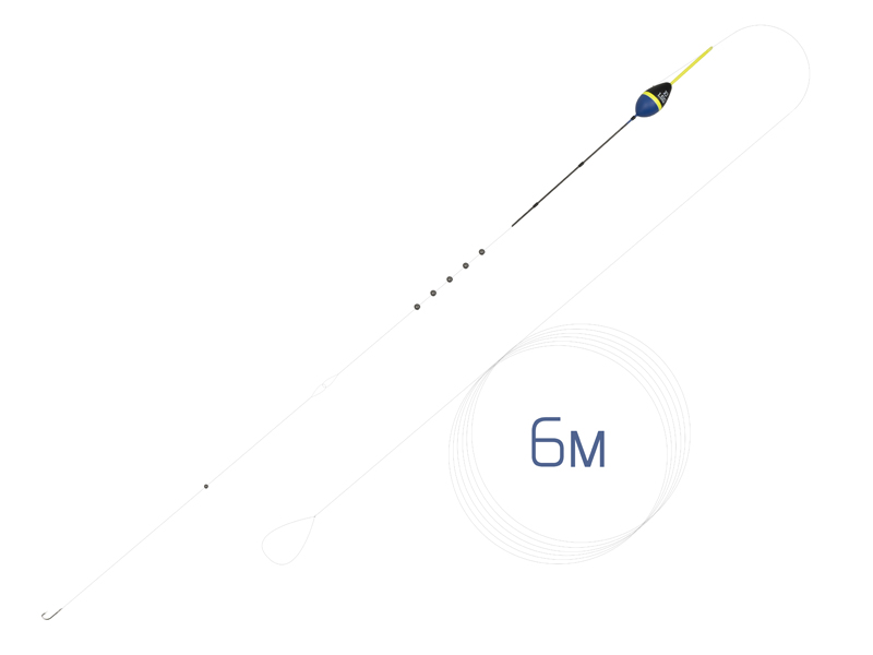 A ready-made 6 m piece suitable for pole fishing includes a tear-shaped float weighing 0.5-3 g balanced with lead shots and fitted with a rig and a flat hook.