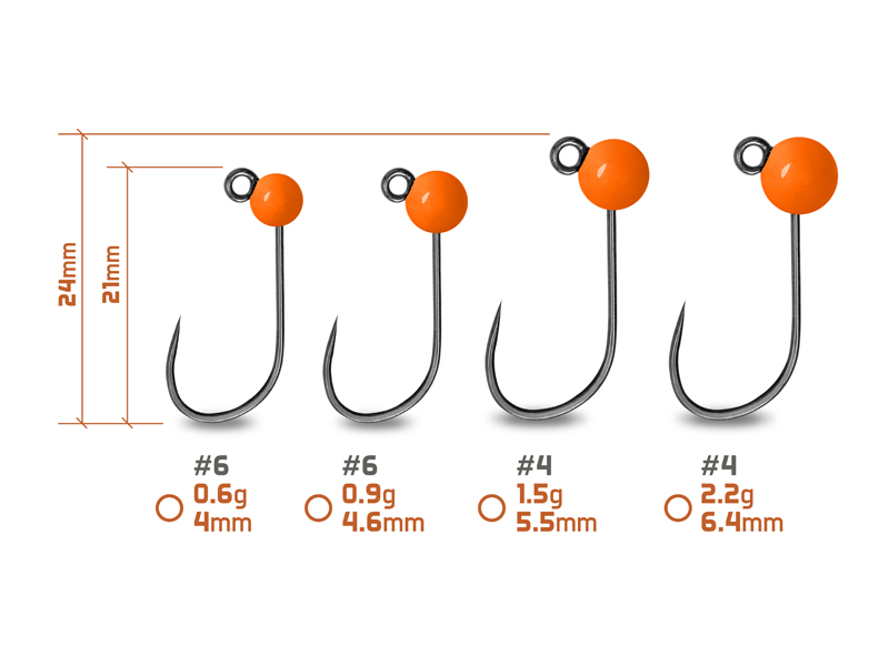 Volframjigipea – ideaalne valik kergete ja ülikergete peibutiste püügiks.Peamine eelis on volframi väga suur tihedus – see metall on ligikaudu kaks kolmandikku raskem kui plii. See tähendab, et sama kaaluga jigipea on oluliselt väiksem ja vähem silmatorkav. Väiksem maht tekitab vähem õhu- ja veetakistust, võimaldades pikemaid heiteid ning märgatavalt kiiremat vajumist põhja. Materjali kõvadus tagab ka väga hea tundlikkuse, olgu selleks põhjastruktuuri tunnetamine või kõige õrnemate võttude märkamine ridva tipus.Volframjigipead on varustatud tugevate ja eriti teravate ogadeta konksudega, mida on lihtne eemaldada ning mis vigastavad kala minimaalselt. Konksu spetsiaalne kuju tagab kohese haakumise kala suus ning hoiab saagi kindlalt väsitamise ajal. Suur silm on praktiline detail, mis teeb rakenduse sidumise kiireks ja mugavaks.Saadaval olevad värvitoonid katavad enamiku püügitingimusi. Fluokollane ja fluooranž on eriti tõhusad värskelt asustatud kalade püüdmisel, kui on vaja kala rünnakule provotseerida. Kuld ja hõbe on ajatud klassikud, mis töötavad peaaegu alati ja igal pool ning on tänu oma peegeldusele eriti efektiivsed päikeselise ilmaga. Selges vees ettevaatlike kalade püüdmiseks on ideaalne valik vasevärv, kuna see näeb veekeskkonnas loomulik välja.Valikus on mitu erinevat jigipea kaalu ja läbimõõtu, et valida sobiv variant vastavalt püügikoha sügavusele ja veevoolule. Erinevad konksusuurused võimaldavad kasutada erineva suurusega pehmeid lante